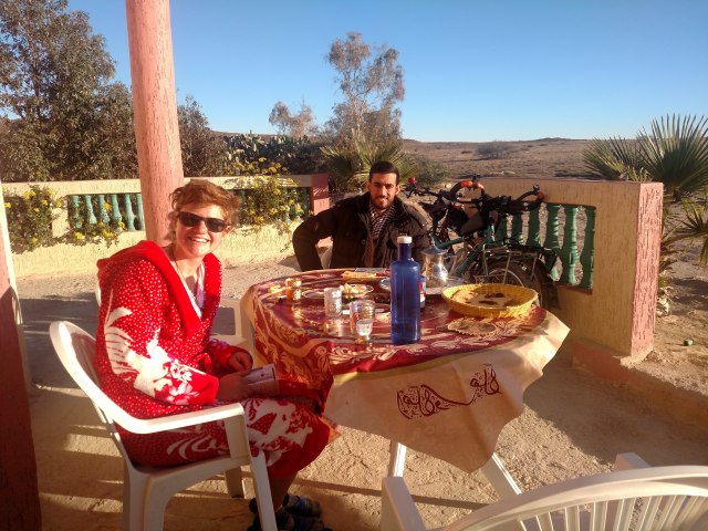 We decided to roll up to a house to ask permission to camp on their land. The house had only two women in it and Heidi tried to communicate with them using google translate to decent effect since they only spoke Arabic. They quickly invited us in and a brother of one of the women came over from another house to host us and allow us to stay! They cooked us food, let us sleep inside and he even helped me with fixing my bike! It was a great experience on only our second day and we were definitely feeling welcome at the warm welcome and the hospitality we kept receiving. We spent the evening chatting in our broken french and showing many pictures since that can tell a story better than my terrible French pronunciations.