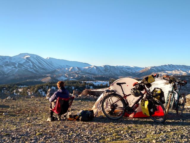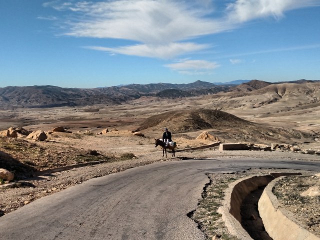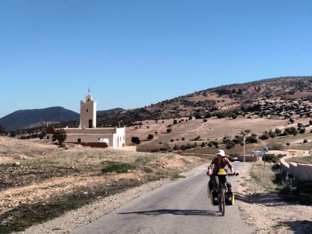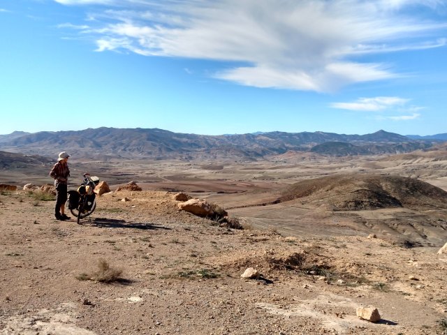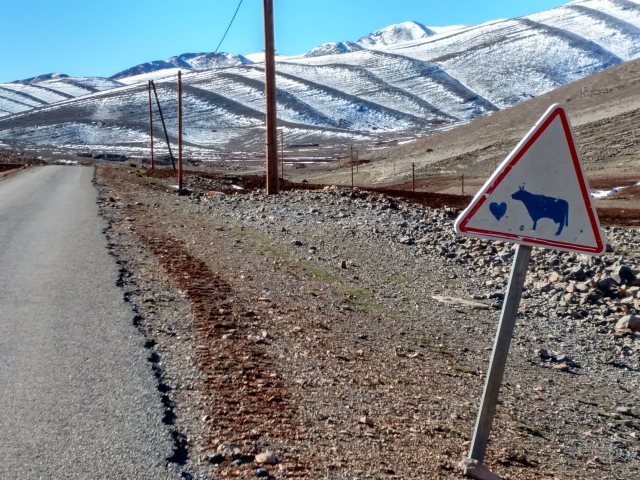 We stopped after a while for lunch right on the side of the road in a flat spot to sit and hang out. Heidi decided to wander about a little and I sat near our things while I had our little solar panel out to charge up my phone. As I was sitting there a shepherd appeared out of nowhere and I smiled and waved and said hello in Arabic and French. He didn’t respond at all and just walked up to our little pile of things and started pointing at stuff. I thought he was curious about what we had and I showed him my backpack, he immediately gestured at himself inferring that I give him the backpack. I smiled and said no in Arabic, not even sure if he spoke Arabic or a local dialect instead. He then grabbed Heidi’s backpack and began pulling things out, luckily the first thing he pulled out was a ziploc baggy with just some smashed muffin crumbs, which seemed to disappoint him and he put the pack back down. I was immediately feeling a bit uncomfortable as he wasn’t trying to communicate and just claiming everything he saw as his in a rather unfriendly manner. I called out to Heidi telling her we needed to get going as I smiled in his direction, reassured he didn’t understand what I was saying. He then walked up to me and took my sunglasses right off of my face and put them onto his face and pointed at himself claiming them as his. I nervously laughed disarmingly and carefully took them off of his face. I was starting to wish the police escort would suddenly show up. Heidi arrived and we quickly and politely packed up and I tried one last time to be kind and shake his hand as a goodbye. He took my hand and then wouldn’t let it go while just intensely glaring at me. This made me very uncomfortable and I really had to yank my hand away to get away from him and we slowly cycled off up the hill while he stood there staring at us.