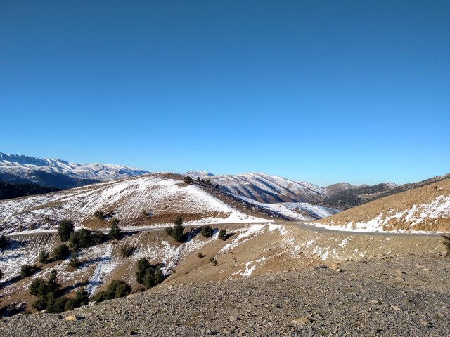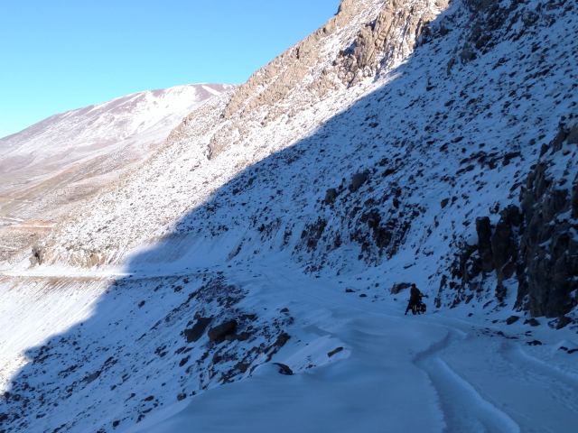 We finally came to the turn off to get to the top of the pass and we noticed right away that it had not been plowed of snow. The road had been clear to this point but the last steep 5 km to the top of the pass was deep snow on a road dug into the shady north side of the mountains. After the bad interaction with the shepherd and the women we were feeling very uncomfortable and wanted to get out of that area quickly. For once we wanted the police to be there but the best we could do was push our bikes along extremely slowly through the snow and nervously look about wondering if the next shepherd we met would be the nice kind or the other kind…