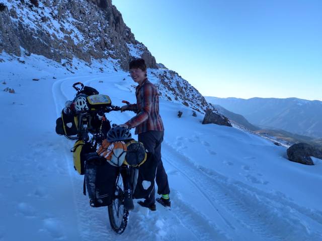 Finally after a struggle fest of over an hour we got to the top of the pass and happily saw that the other side, facing south was melted clear and we could ride our bikes down. On the other side we quickly ran into another police escort which we more willingly accepted after the interaction with the shepherd. We knew it was just one guy and that everyone else had been nice, but after one interaction like that it can easily throw you off balance and make you nervous of others. Plus with the constant police escort we couldn’t help but wonder yet again, why? Is there something we need to know, is there something going on in the area? But yet again our questions of why they followed us was for our “security” and that it was also a very safe area with no problems and nice people.