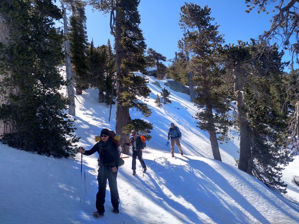 Sleeping in the cabin on top of San Jacinto was interesting to say the least. It was bitterly cold, and it looked like the bunks would collapse in on each other. Despite this no one was squished and we enjoyed slipping and sliding down from the summit the next morning. One of the few benefits of snow travel is that when going downhill you can just go wherever you want (within reason) and cutting straight across country is often a better choice than following a windy gps trail you can’t even see.