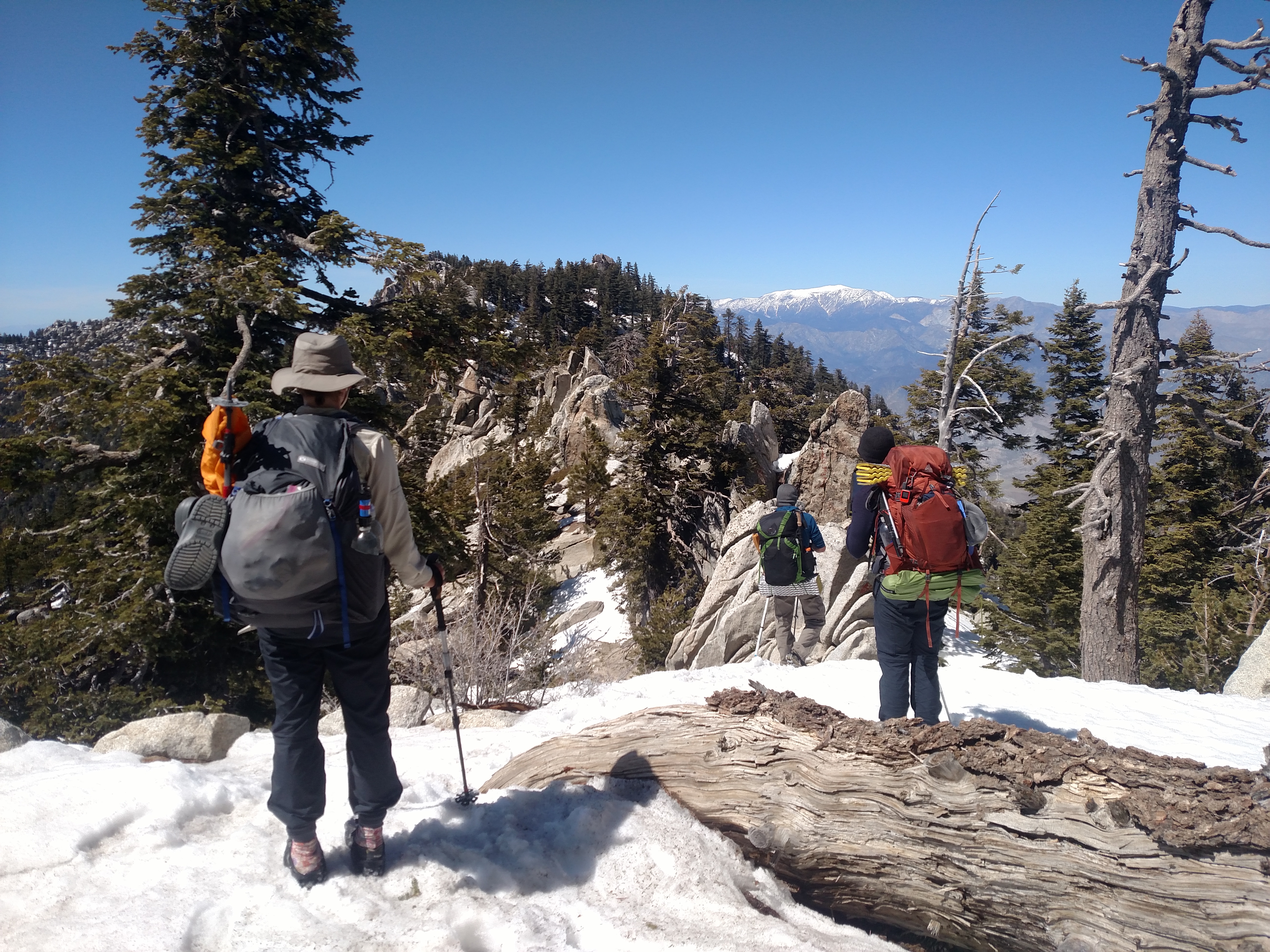 As we continued walking on the snow we had one of the more infamous areas ahead, Fuller Ridge. This was fear mongered by many in Idyllwild and we were not certain of what it would be like. As we were traversing a ridgeline there were a few steep spots but nothing out of the ordinary or even as steep as Apache Peak’s traverse.