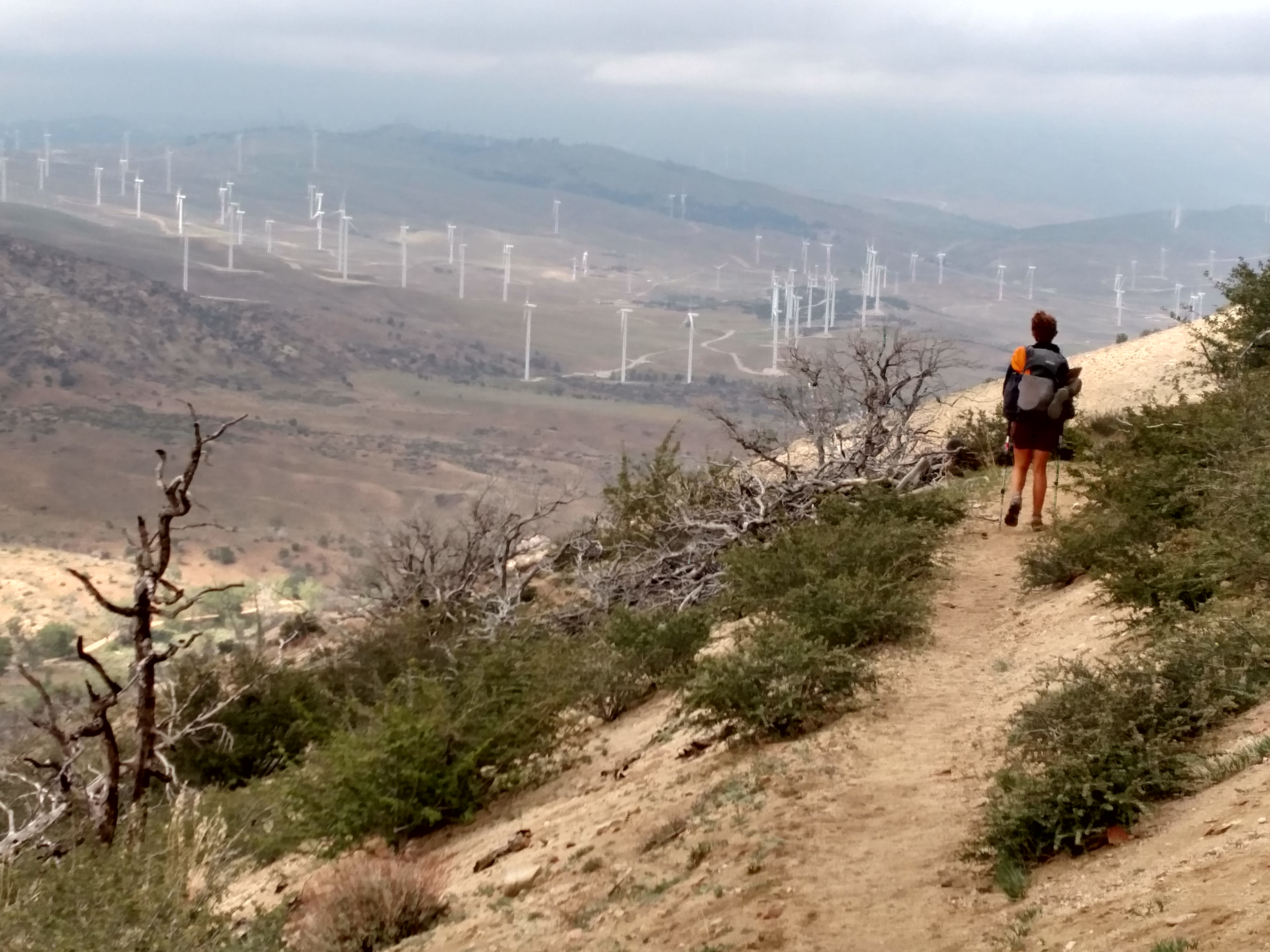 On our first night in the windmills we tried to push to a valley with water but it got dark and we camped in the middle of the windmill farm. The windmills have blinking red lights and I noticed while lying in the tent that there were occasional white flashes. I was wondering if it was a different kind of light from the windmills until I started hearing the thunder. Sitting in a tent on an exposed hillside during a lightning storm made for an interesting night of tense sleep as the inside of the tent was illuminated in flashes every few minutes.