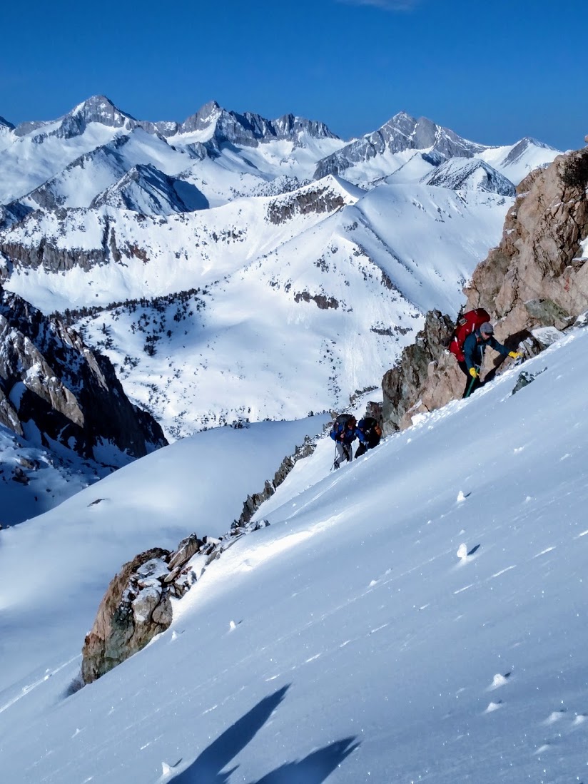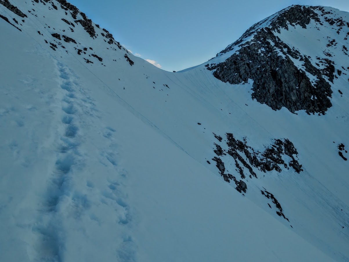 On one of the rocky traverses Ninja had a panicked moment. He suddenly didn’t want to be on the slope anymore and quickly over climbed to get into the lead so he could get to top of the pass as soon as possible. We continued onward in our line with a big drop off below and quickly caught back up with Ninja as he was trying to hack his way through an avalanche zone.