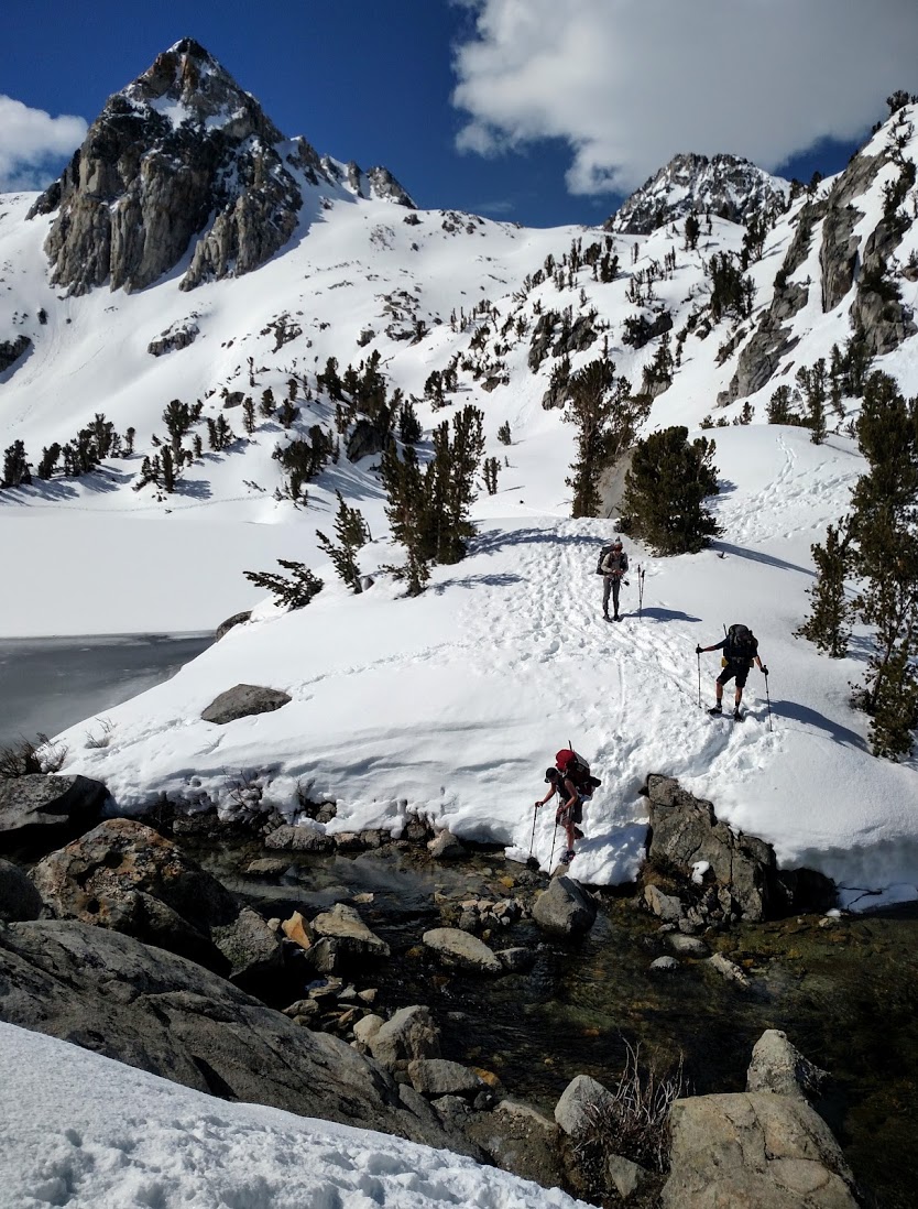 We descended Pinchot rapidly, racing the sun and trying to get into the trees before the massive snow faces began to warm up and the hellish post holing would begin. At a river crossing we arrived at the remains of a camp from our counterpart group where we ran into another hiker, Graceland.