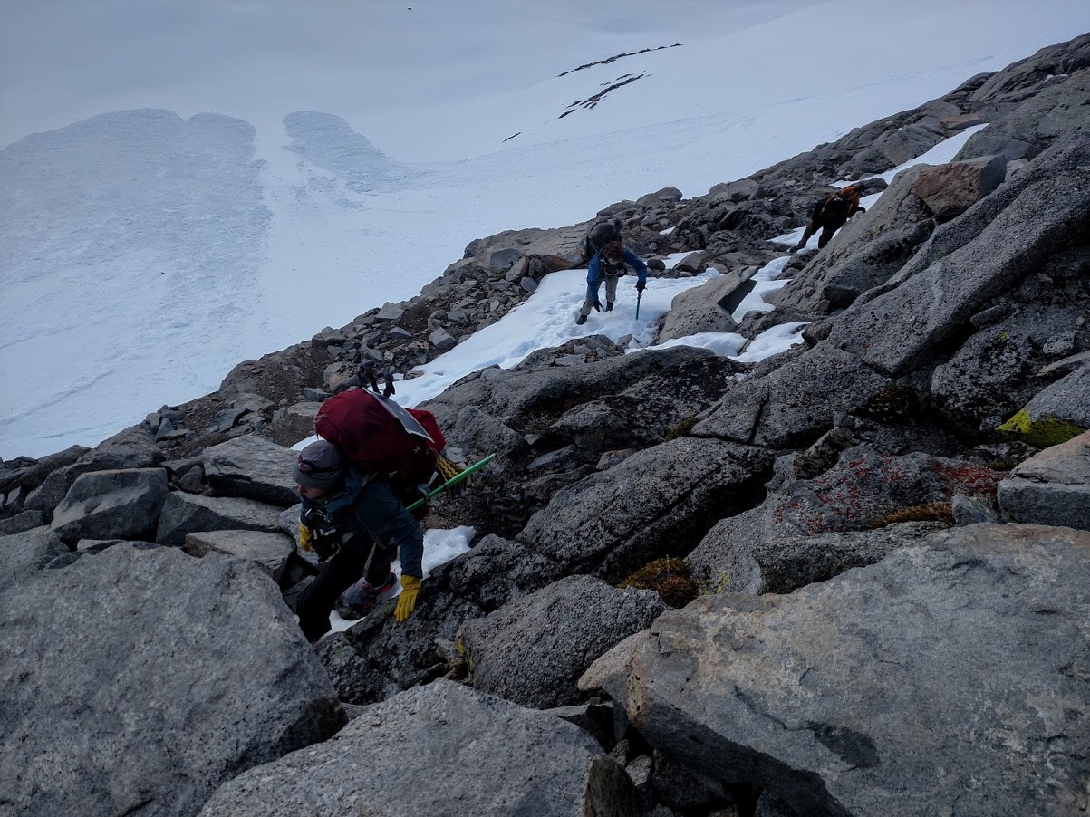 At one point on the rocks I stumbled across a bear cannister! It appeared to be extremely sun bleached and had most likely been there for many months. Ninja caught up with us at this point and curiosity got the better of him, so he opened up the bear can. The most deathly smell filled the whole area. Happy Feet and Ninja gagged from the smell while Uky called up to us asking what the smell was. We quickly put the lid back on and had to leave it behind since it was a completely full bear can and we were too exhausted to consider carrying it.