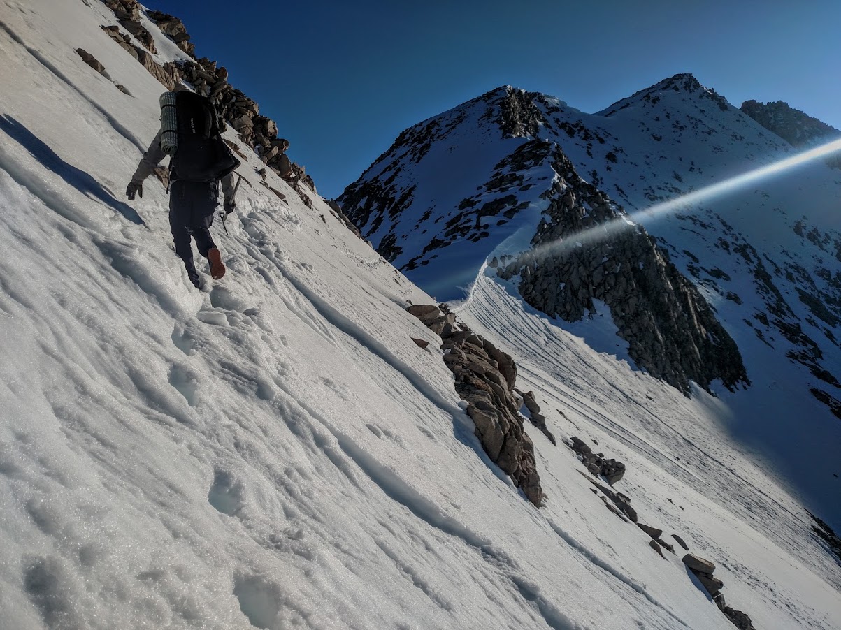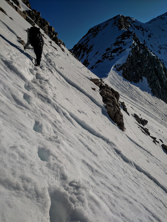 It was grueling going with lots of scrambling over rocky slopes interspersed with following the frozen steps. We quickly noticed the severity of the avalanches from the previous day since the steps were washed out in massive swathes from slides that had occurred in just the last 24 hours. With the quickly warming climate all of the major snow faces were experiencing large spring condition slides making it a pain in the ass to hack out steps across frozen faces in packed avalanche snow. I was leading this ascent so I had allot of time to attack the snow trying to make steps over the icy chunks with my trusty ice axe,Lenny Kravaxe.