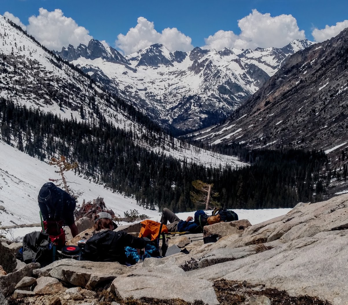 Despite the injuries and days of downtime the social atmosphere was fun. On the third day a hiker we hadn’t seen for a while showed up, Bird. We had met her at Big Bear Hostel and seen repeatedly since then. Her group, who had entered the Sierras six days before ours, had been totally broken up by the conditions and were scattered on and off the trail to various places. Bird had returned to where they had left trail and was looking to join a group for the next section. We happily accepted her into ours and finished our preparations and ressuply.