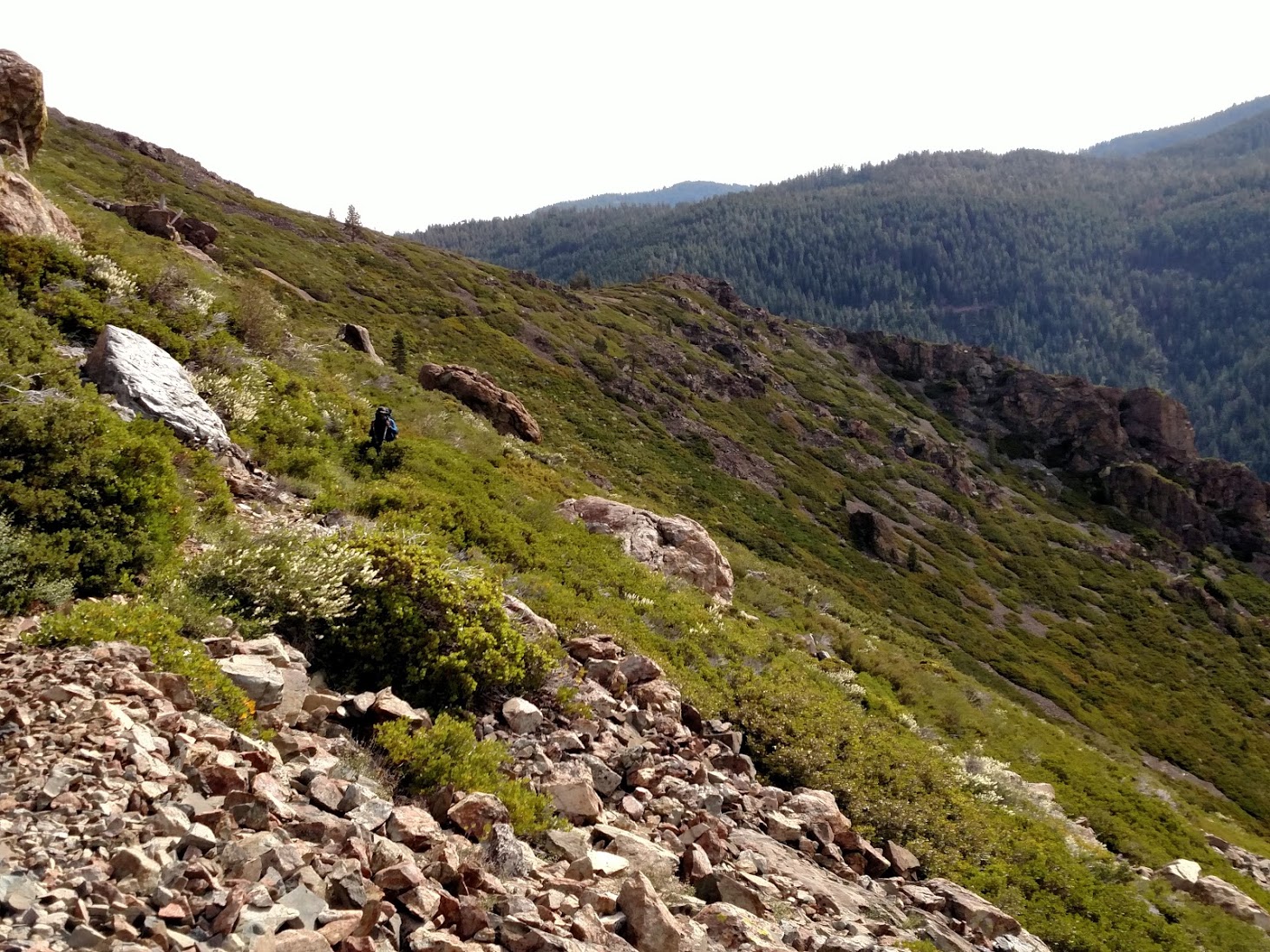 The descent was steep but nothing too difficult especially in comparison to what we had already accomplished in the Sierras. At the intersection we looked up at the slope Happy Feet had wanted to use as a short cut and noticed several massive cliffs and snowy scree slopes, we would definitely be waiting for him. Once him and Bolo caught up we continued onward towards what we had been told should be the proper end of the snow for us!