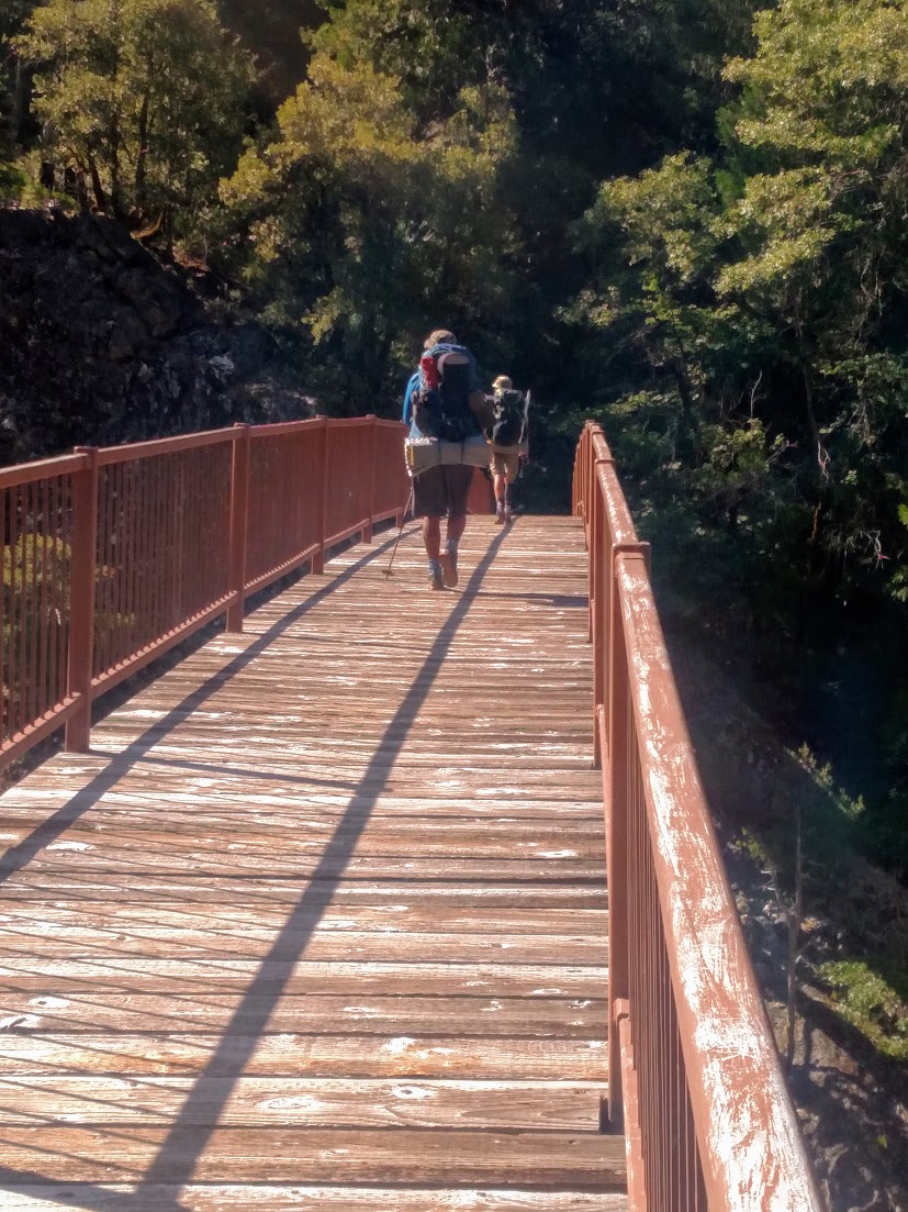 The trail dropped down steeply to a river bottom with a massive bridge where we could see an area popular with white water rafters and gold miners alike. We also ran into the first rattlesnake we had seen since the desert as it noisily blocked our way on some steep switchbacks.