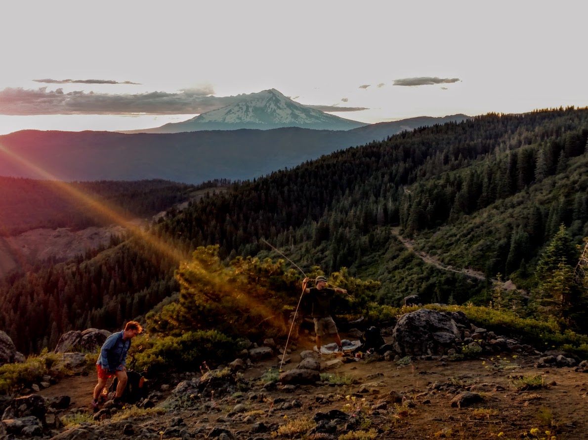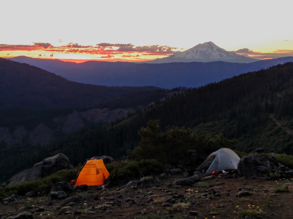 This section of trail transitioned quickly from hot exposed high desert to cool pine forest as we approached Mt Shasta. For the last part of our day the trail was completely overgrown for almost two miles. Hardly being able to see where the path went we had to trust in the open areas around our feet to tell where to go. At the top we had one of the most spectacular camp spots looking over Shasta, this volcano would be our constant trail companion for the next few weeks always present on the horizon.
