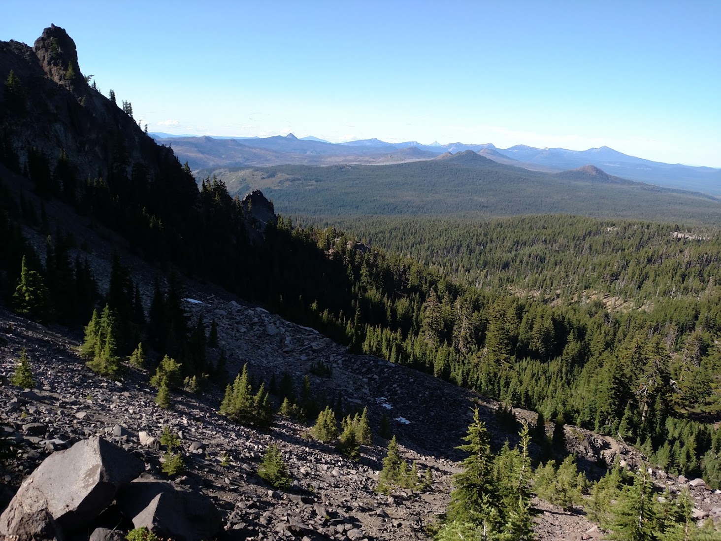 Happy Feet and I got up at 2 a.m. to begin since I wanted to get to Century drive at a reasonable time to hitch hike into Bend before it was dark and we set off into the dark. We pushed a hard pace and covered allot of ground in the early hours talking to distract ourselves from the lofty goal. While walking through one campsite near a lake at 4 in the morning we accidentally awoke a PCT hiker camped there and from the tent he called out “is that you Cro?” It was Superman, a hiker we had met in Kennedy Meadows! We said hello briefly but quickly said goodnight so he could go back to sleep before Happy Feet and I pushed onward. It was interesting hiking along ridgelines in the pitch black of the moonless night, we knew there were views around us but it looked like the cliffs and hills just rolled off into an impenetrable blackness.