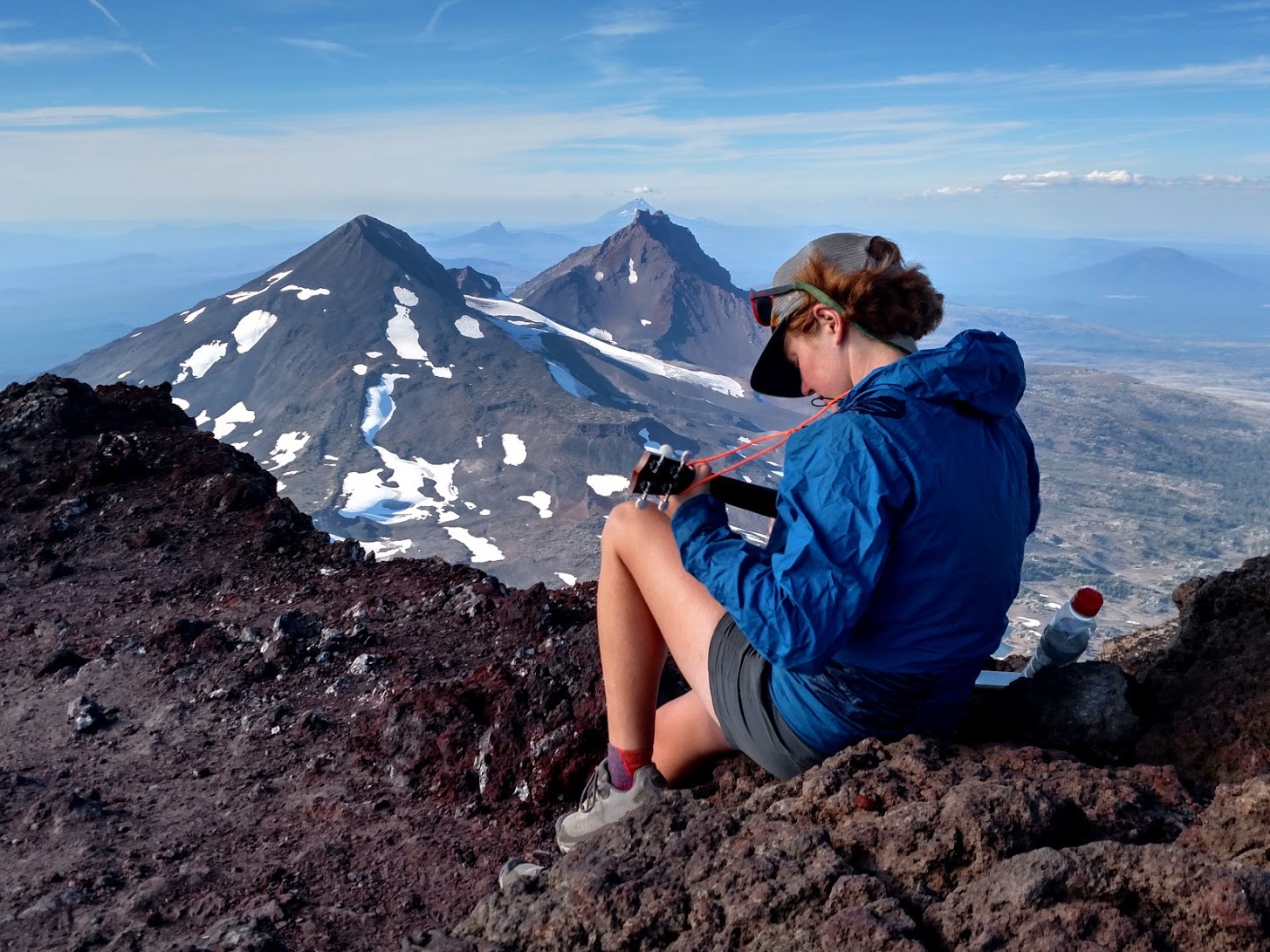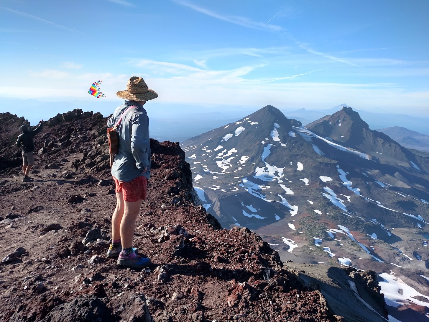 Once at the top we quickly set up camp in the improvised wind shelters and then wandered over to the true summit to enjoy the view and relax in our awesome camp spot. Town, being the mechanical engineer that he was, re-engineered his wind shelter while Happy feet wandered around trying to get his kite to fly (he had recently acquired it from a hiker box) while Bunyon practiced her ukulele and befriended another summit camper who also happened to be a musician.
