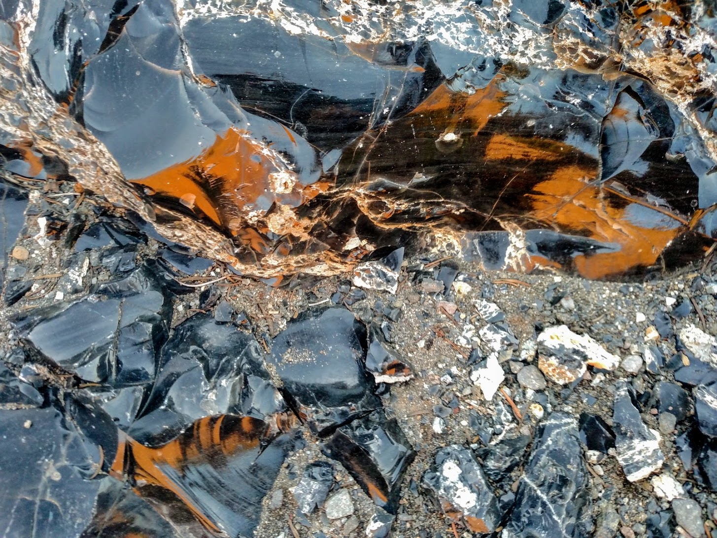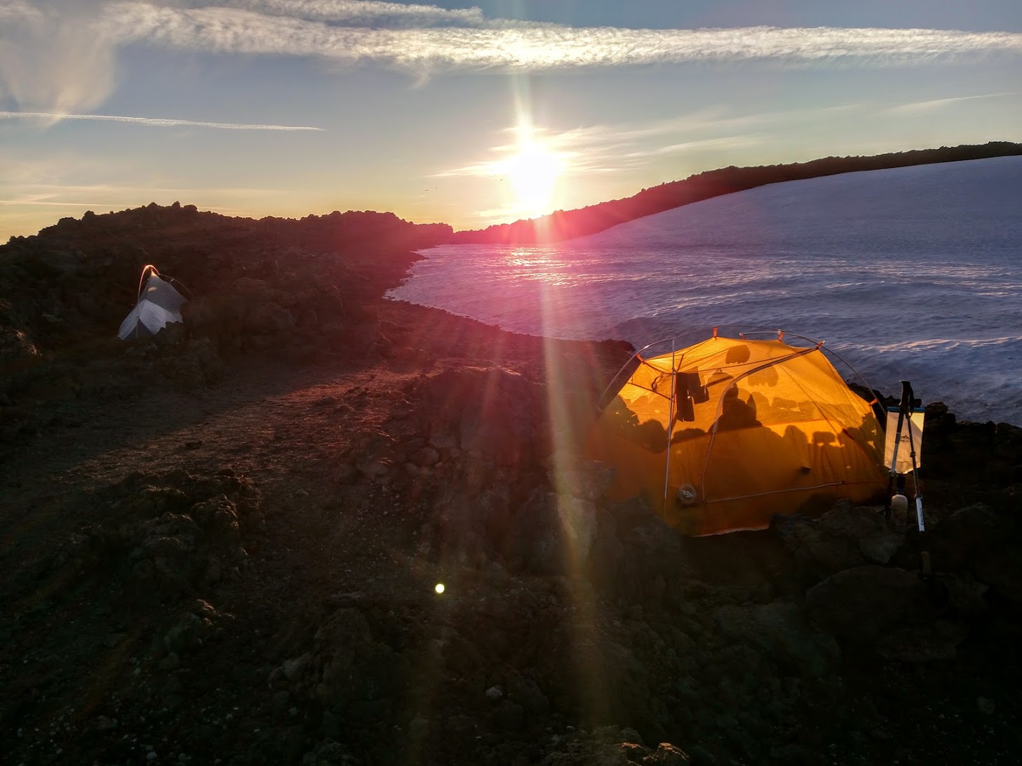 At one lake we enjoyed a little swimming and befriended two back packers who were out for a shorter trip. Town elected to hang out with them while the rest of us continued on to camp just north of the Obsidian Falls area near the base of North Sister. The obsidian was beautiful and I even had a wonderful photography moment capturing the reflection of the sun setting on North Sister in a particularly massive slab of obsidian.