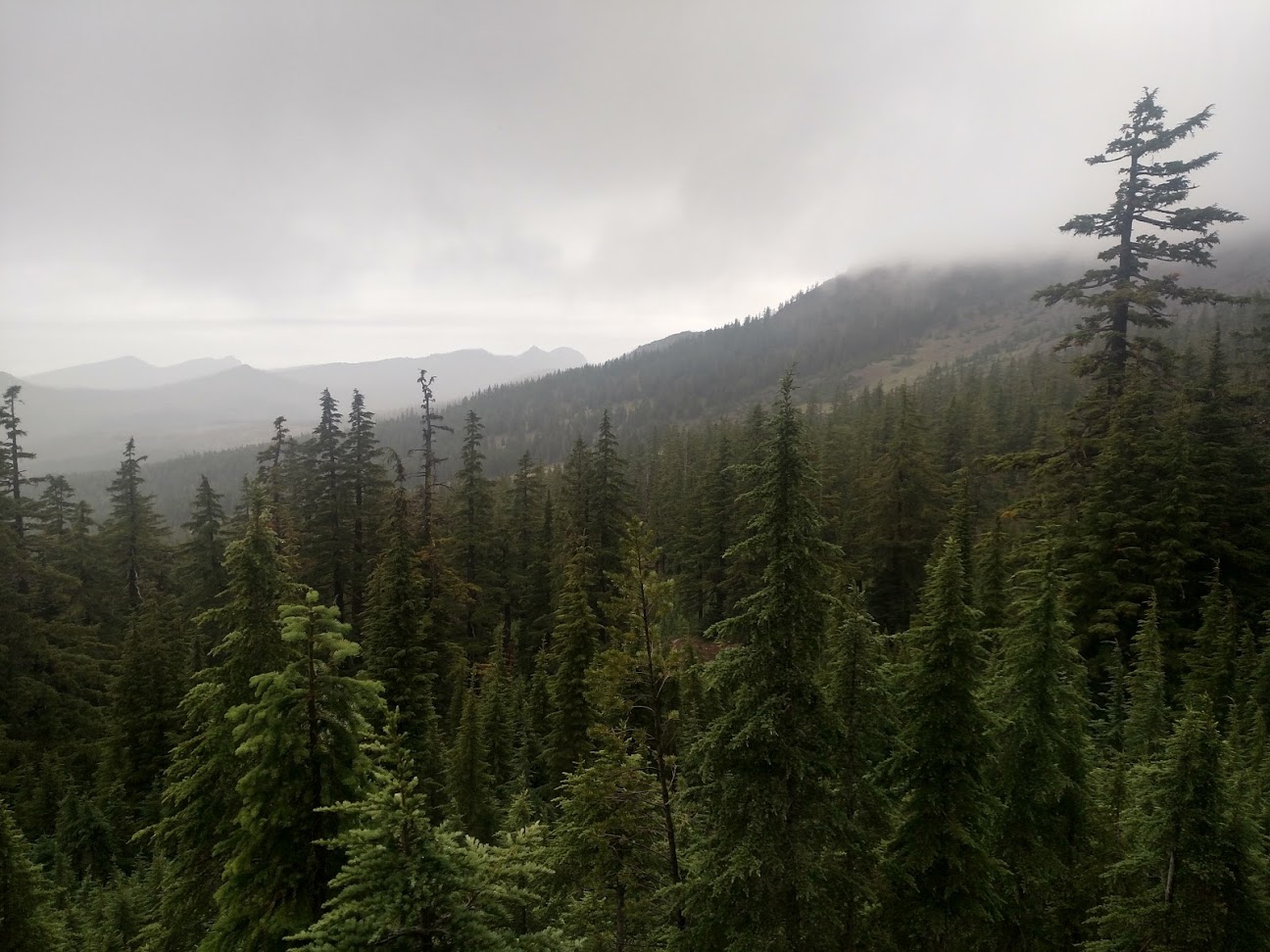 Eventually I arrived alone at what was supposed to be a beautiful camp spot on top of a ridge looking north towards Mt Jefferson. For me it was a cloudy expanse with even more wind and rain. I quickly set up my tent and jumped inside soaking wet. It was a cold night and I heard a few other hikers stumble by in the rain outside as I fell asleep.