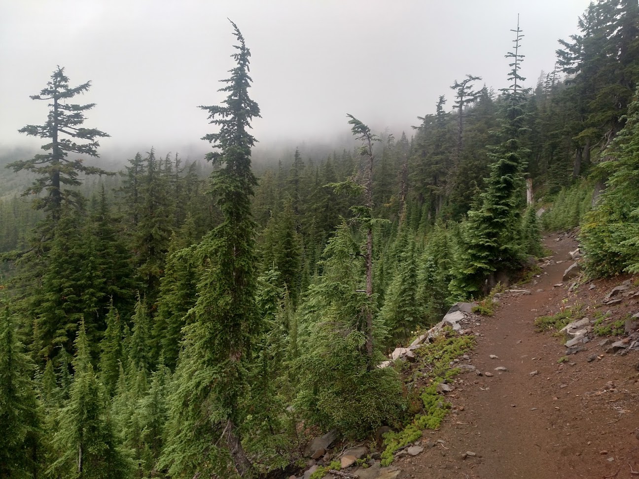 The views were sadly obscured by the rainy and clouds and I didn’t get a single look at Three Fingered Jack even though I knew I was hiking right along its base. As the day progressed I noticed my headphones cutting out and eventually they died all together, most likely due to getting wet in the rain. This was a big disappointment since music was a huge part of keeping me motivated when hiking alone, but with them broken i decided to challenge myself to hike without them and be fully present alone on the trail.