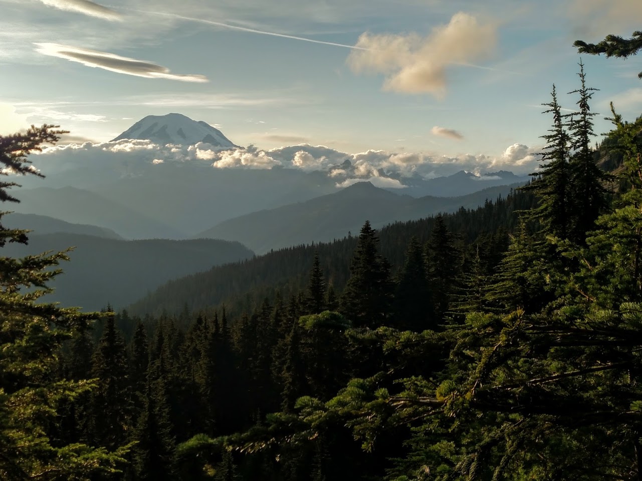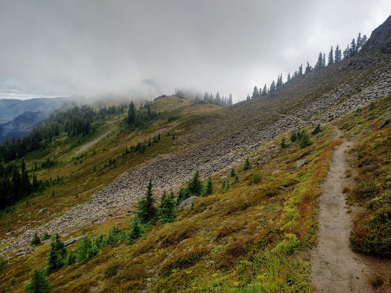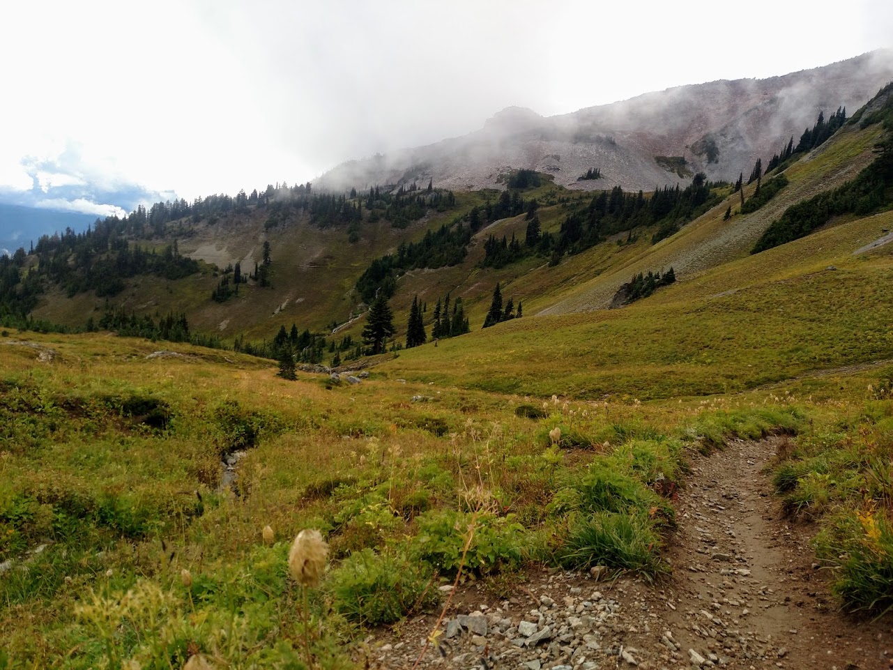 The following day we wound higher up getting better views of Mt Adams as it poked through the thickening clouds. We knew it would begin to rain again soon but hoped to get past the higher elevation points on trail near Goat Rocks before it started again.