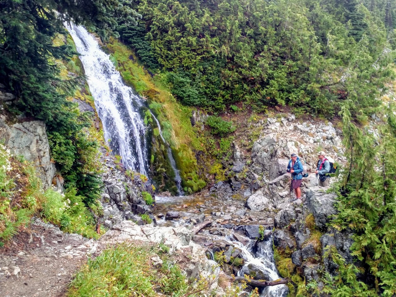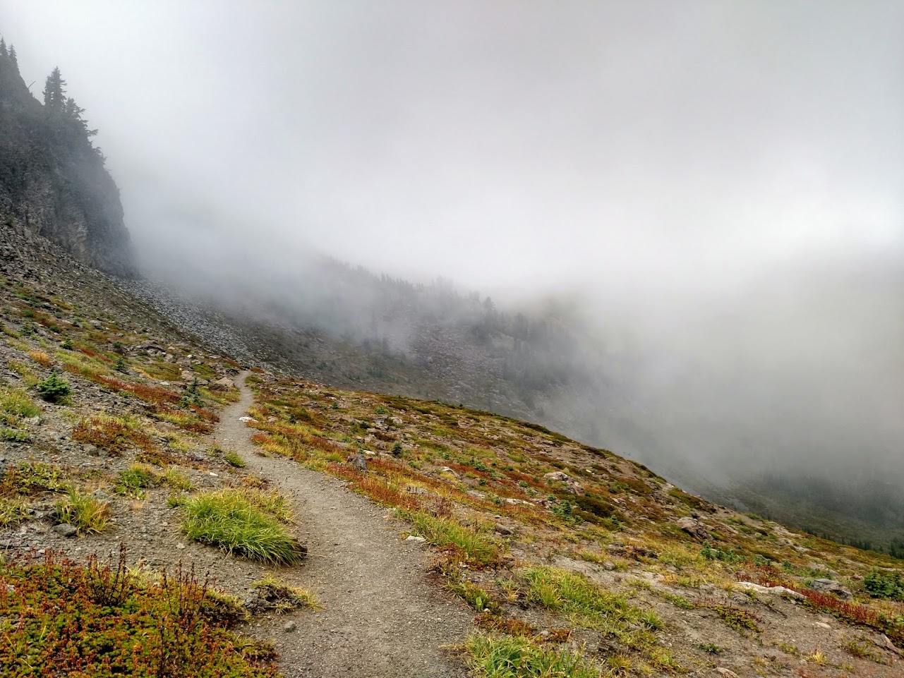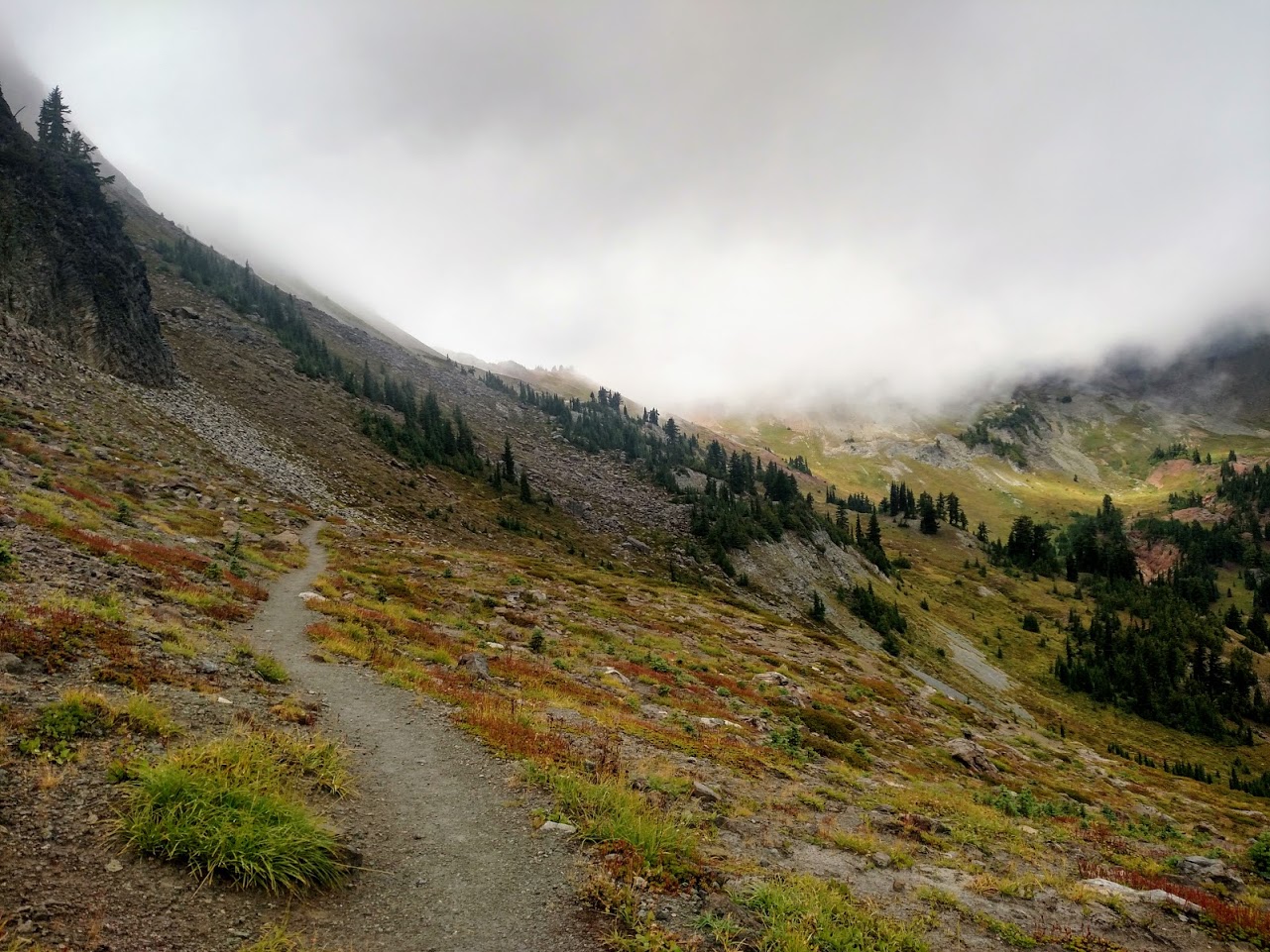 The following day we wound higher up getting better views of Mt Adams as it poked through the thickening clouds. We knew it would begin to rain again soon but hoped to get past the higher elevation points on trail near Goat Rocks before it started again.