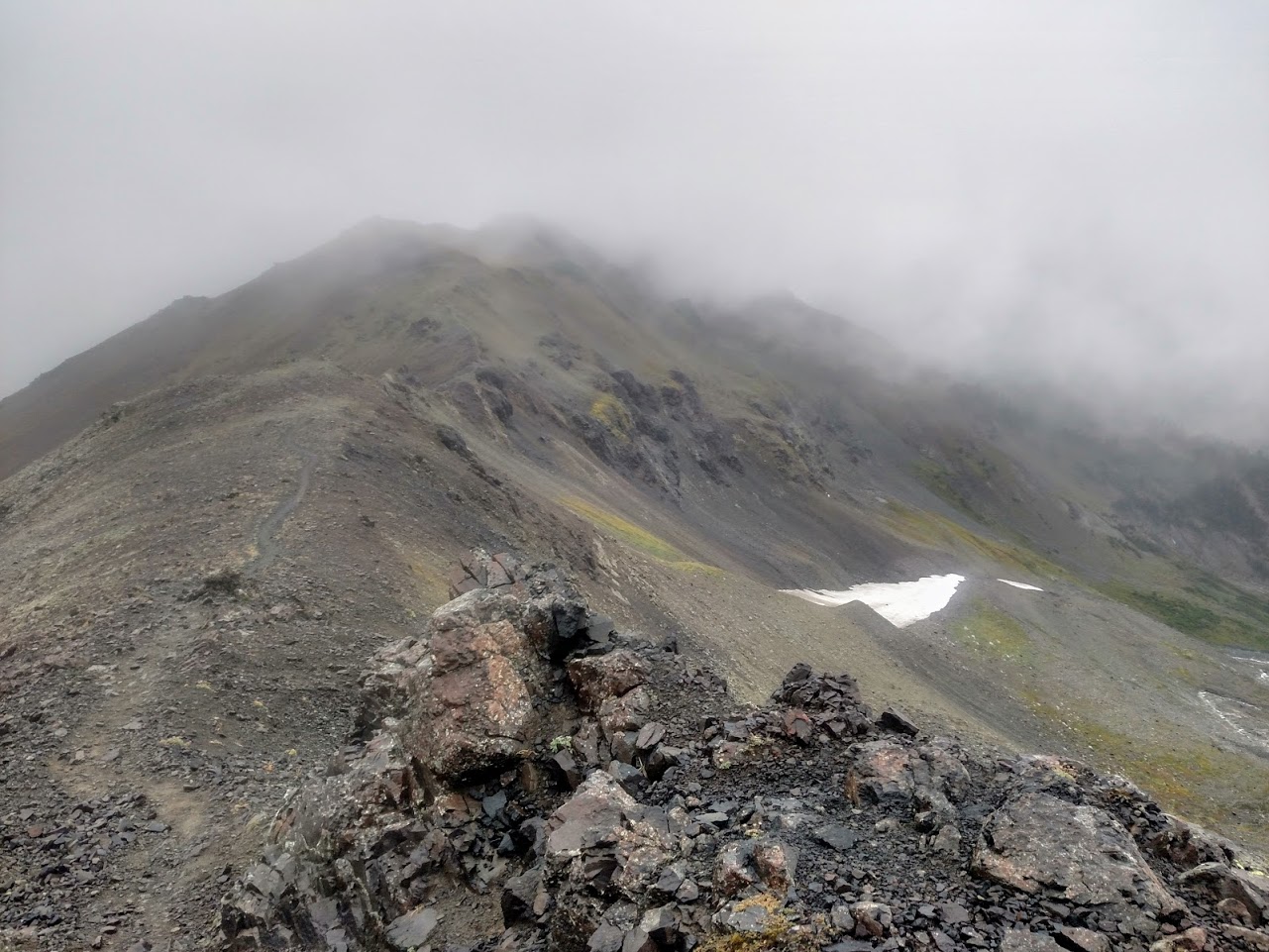 The weather continued to deteriorate and when we pushed out along the knife edge we were met with miserably cold wind and rain. No photos were taken and no views were savored. We simply pushed hard to get it over with observing the vertigo inducing drops on either side as the clouds would rush past, revealing briefly, the massive cliffs awaiting those below for anyone that might slip.